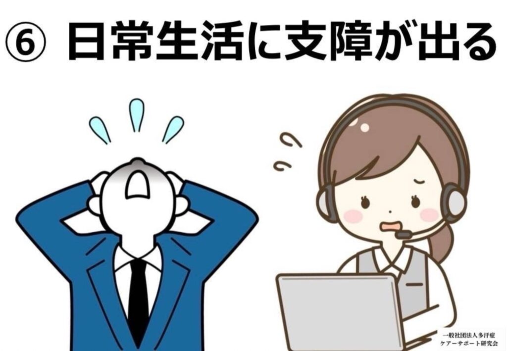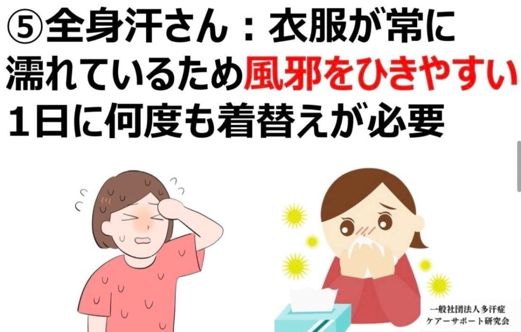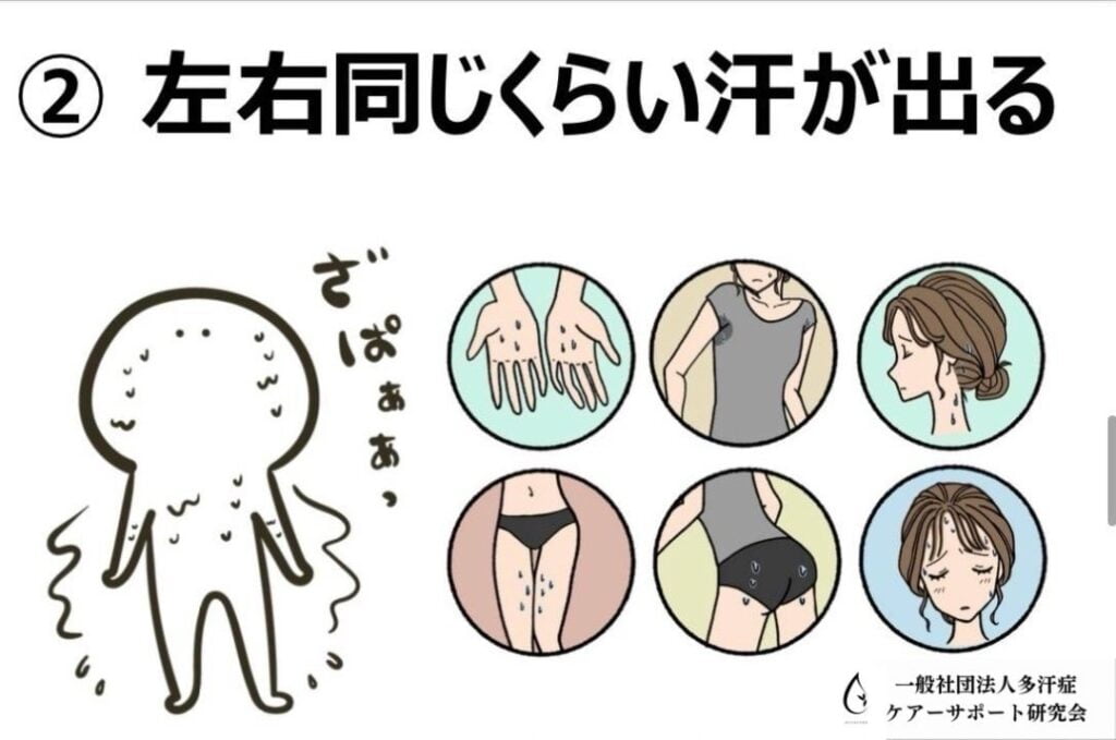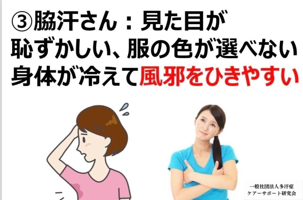 Hyperhidrosis is a condition in which the body sweats excessively, caused by overstimulation of the sympathetic nerves. This condition affects daily and social life and can cause psychological stress and loss of self-confidence. Treatment methods include antiperspirants, drug therapy, and surgery, but 100% suppression of sweating is physically and medically impossible.